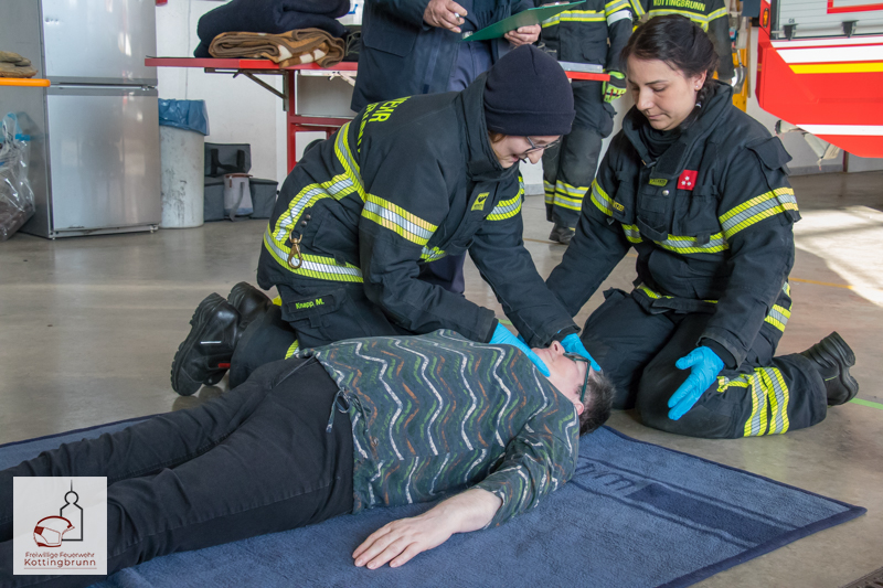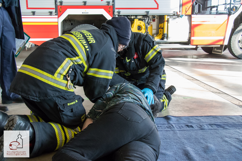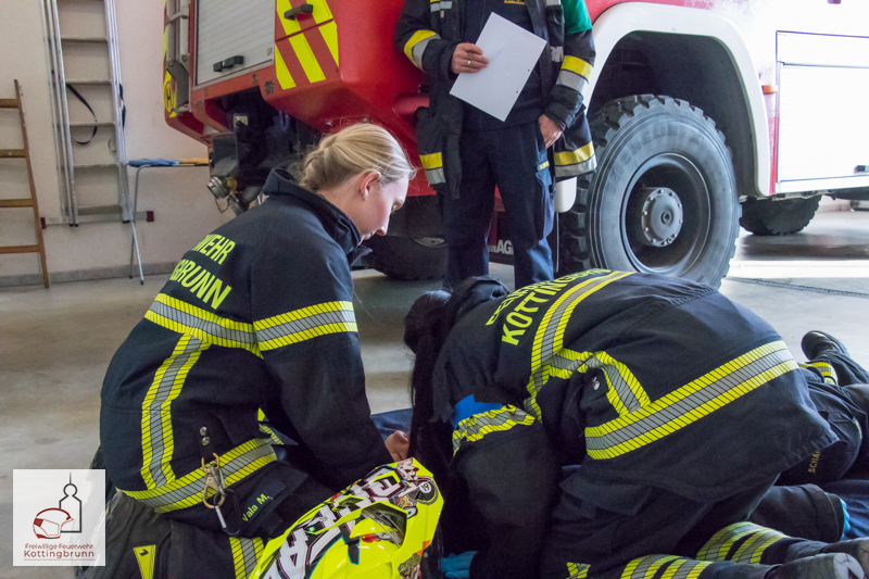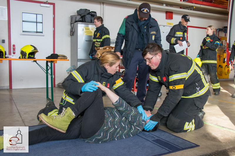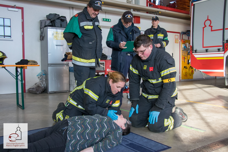 Begonnen wurde im Feuerwehrhaus mit den Stationen der Ersten Hilfe, wo die jeweiligen Zweierteams die einzelnen Stationen absolvierten. Darunter waren unter anderem die Rettung aus einem PKW, die Stillung einer stark blutenden Wunde, die Schocklagerung, die stabile Seitenlage und die Helmabnahme durch zwei Helfer.