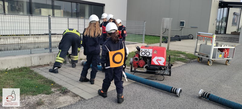 In der darauffolgenden Woche wurde das Gelernte praktisch umgesetzt. Mit dem Rollcontainer samt Tragkraftspritze und dem Tanklöschfahrzeug ging es zur Interspar-Bäckerei in Kottingbrunn. Dankenswerterweise stellte die Firmenleitung das Gelände für die Übung zur Verfügung, da dort eine Saugstelle mit Löschbecken vorhanden ist.