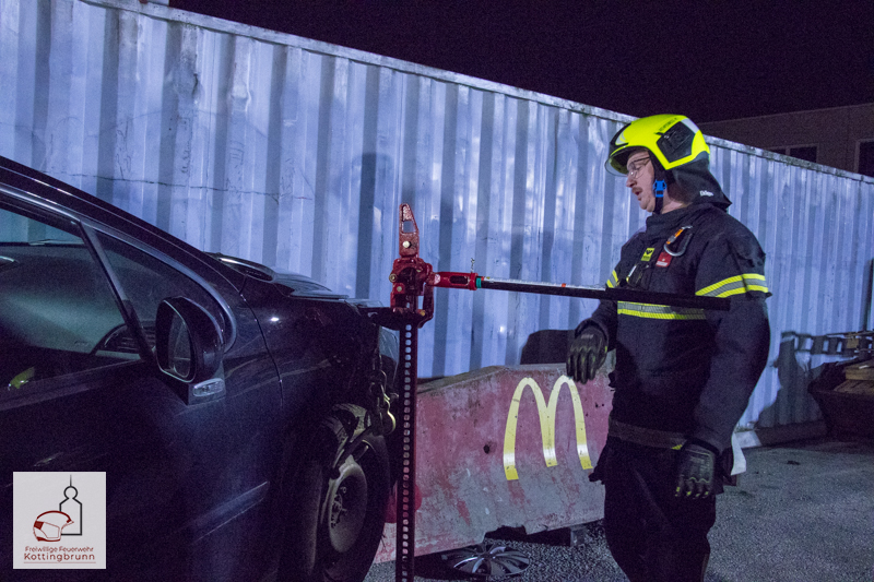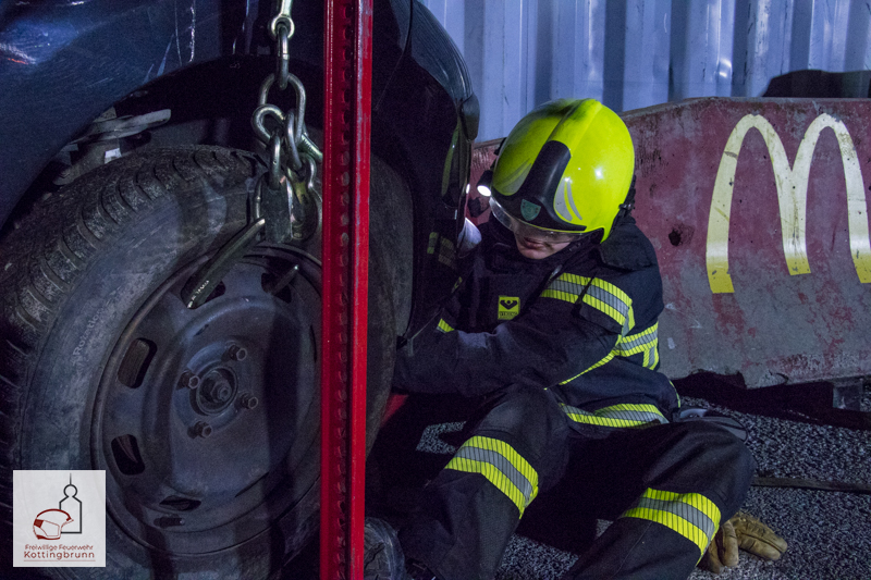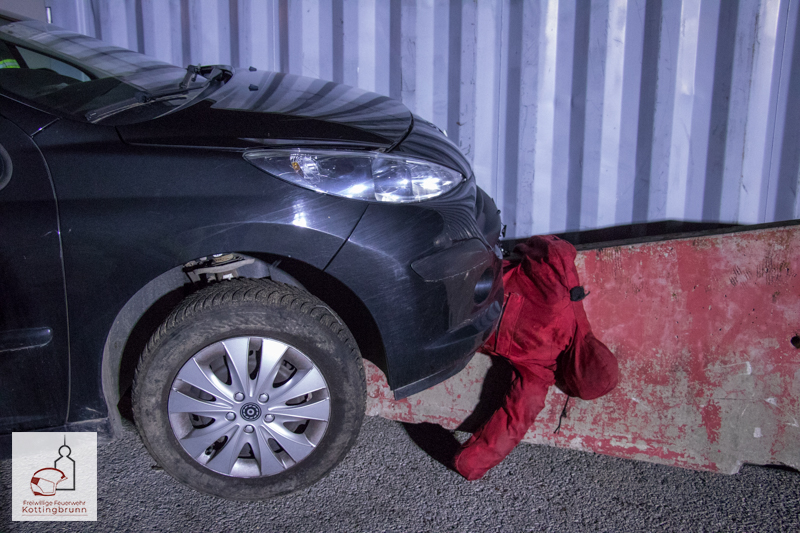 An der ersten Station wurde das Szenario „Person unter PKW“ dargestellt. Eine Übungspuppe befand sich unter einem, auf eine Betonleitwand aufgefahrenen, Fahrzeug. Zunächst wurde das Fahrzeug gegen Wegrollen und unkontrollierte Bewegungen gesichert. Anschließend kam der Zahnstangenheber zum Einsatz, um das Fahrzeug einseitig anzuheben. Während des Hebevorgangs wurde die angehobene Last kontinuierlich mit Unterbaumaterial gesichert. Nachdem ausreichend Freiraum geschaffen war, konnte die eingeklemmte Person schonend gerettet werden.