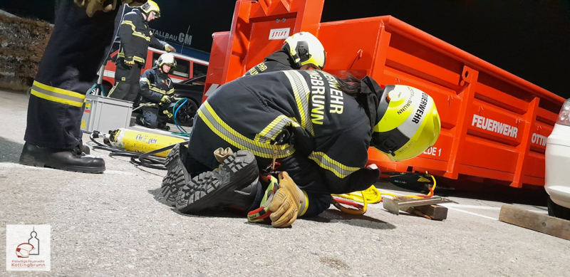 Zum Abschluss der Ausbildung wurde eine gemeinsame Einsatzübung durchgeführt, bei der ein Auffahrunfall mit Unterfahrsituation angenommen wurde. Ein PKW war dabei unter das Heck eines LKW gefahren. Zur Absicherung des LKW-Plateaus kamen Paratech-Stützen zum Einsatz, um ein Absacken oder Kippen zu verhindern. Im weiteren Verlauf wurden Südbahnwinden angesetzt, um das Heck des LKW kontrolliert anzuheben. Die Winden wurden beidseitig positioniert, um ein gleichmäßiges und stabiles Anheben zu gewährleisten. So konnte der LKW ausreichend angehoben werden, sodass der PKW frei kam.