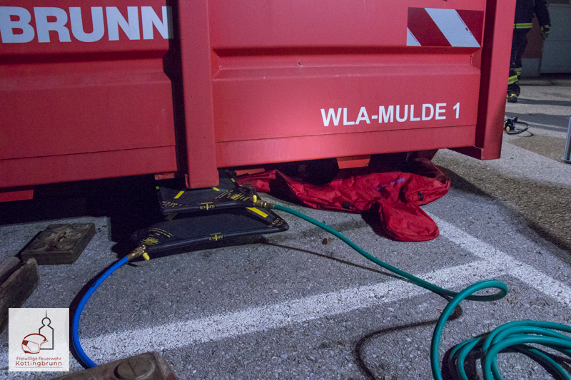 Bei der zweiten Station wurden zuerst kurz die Hebekissen theoretisch besprochen und Einzelheiten wiederholt. Bei der Praxis wurde eine Übungspuppe unter einem schweren Container eingeklemmt. Nach der Erkundung wurden die Hebekissen unter der Last positioniert. Das Befüllen der Hebekissen erfolgte langsam und gleichmäßig, wobei ständig auf eine gleichmäßige Lastverteilung und mögliche Schräglagen geachtet wurde. Parallel zum Anheben wurde die Last fortlaufend mit Holz unterbaut. Nach Erreichen der notwendigen Hubhöhe konnte auch hier die Person gerettet werden.